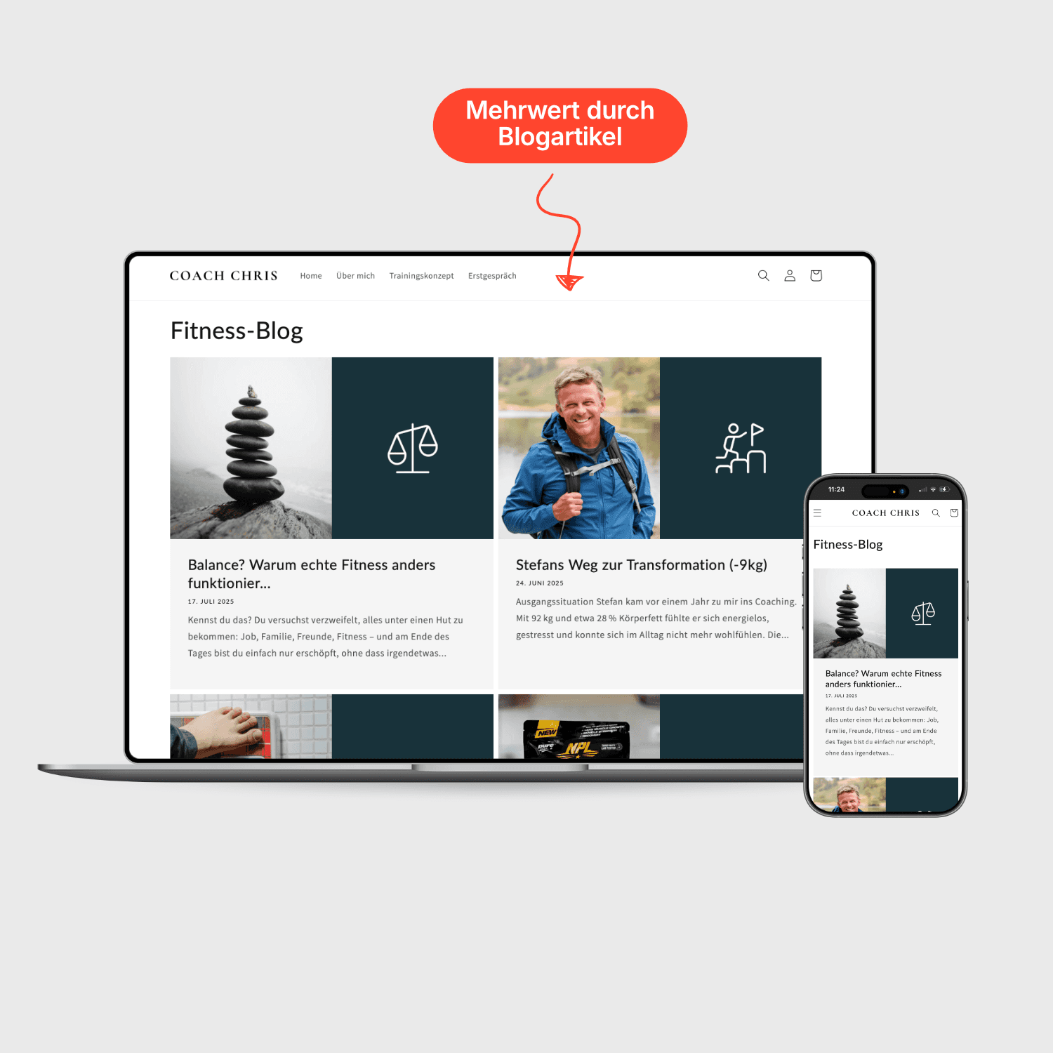 Conversion-Fokus: Durch die Integration eines Fitnessblogs und eines direkten Terminkalenders haben wir die Hürde für die erste Kontaktaufnahme massiv gesenkt.
